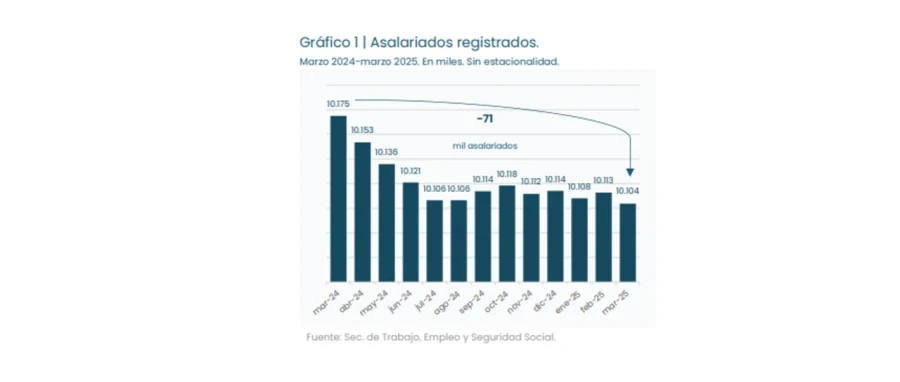 El informe –elaborado sobre la base de datos del Sistema Integrado Previsional Argentino (SIPA), detalla que luego de las caídas consecutivas observadas desde septiembre de 2023 hasta julio de 2024, el empleo asalariado formal total se mantuvo relativamente estancado, alternando leves mejoras con caídas, y en marzo de este año registró una reducción de 9 mil puestos de trabajo con respecto al mes anterior.