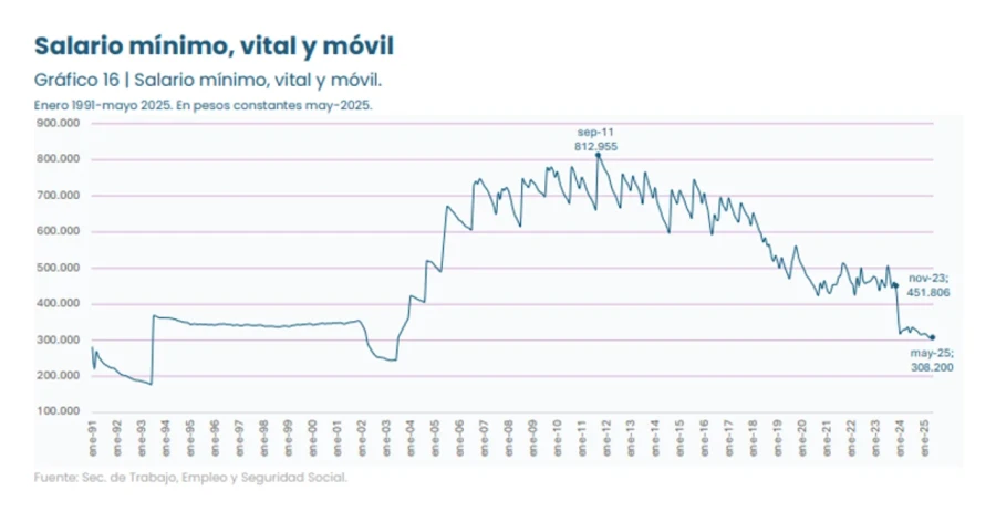 Entre noviembre de 2023 y mayo de 2025 el salario mínimo real acumuló una caída de 32%, que lo ubica en términos reales de mayo de 2025 en un valor inferior al de 2001, antes del colapso de la convertibilidad, según este informe.