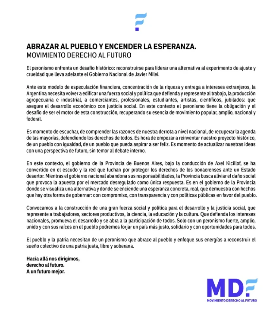 Mediante un comunicado titulado “Abrazar al pueblo y encender la esperanza”, los dirigentes señalaron que el peronismo “enfrenta un desafío histórico” y debe liderar una alternativa al “experimento de ajuste y crueldad” que, afirman, lleva adelante el gobierno nacional.