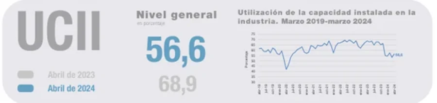 En abril de 2024 la utilización de la capacidad instalada en la industria se ubicó en 56,6%, informó el INDEC. El dato, si bien lógicamente muy abajo en la comparación interanual contra un 68,9% del año pasado, representa una suba de 3,2 puntos porcentuales respecto del 53,4% uso de capacidad de marzo.