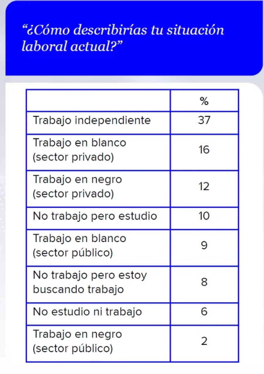 Del total de los que sí poseen empleo, el mayor porcentaje tiene trabajo independiente, con el 37%; le siguen el trabajo formalizado en el sector privado (16%), el trabajo informal (12%), trabajo en blanco en el sector público (9%) y el trabajo en negro en el sector público (2%).