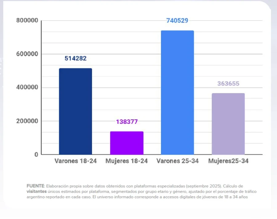 En conjunto, los varones concentran el 71% de los accesos (7 de cada 10) y las franjas de 25–34 años explican el 63 % del total. “Se observa un uso mucho más intenso entre hombres y en los tramos etarios mayores dentro del segmento juvenil”, destaca el documento.