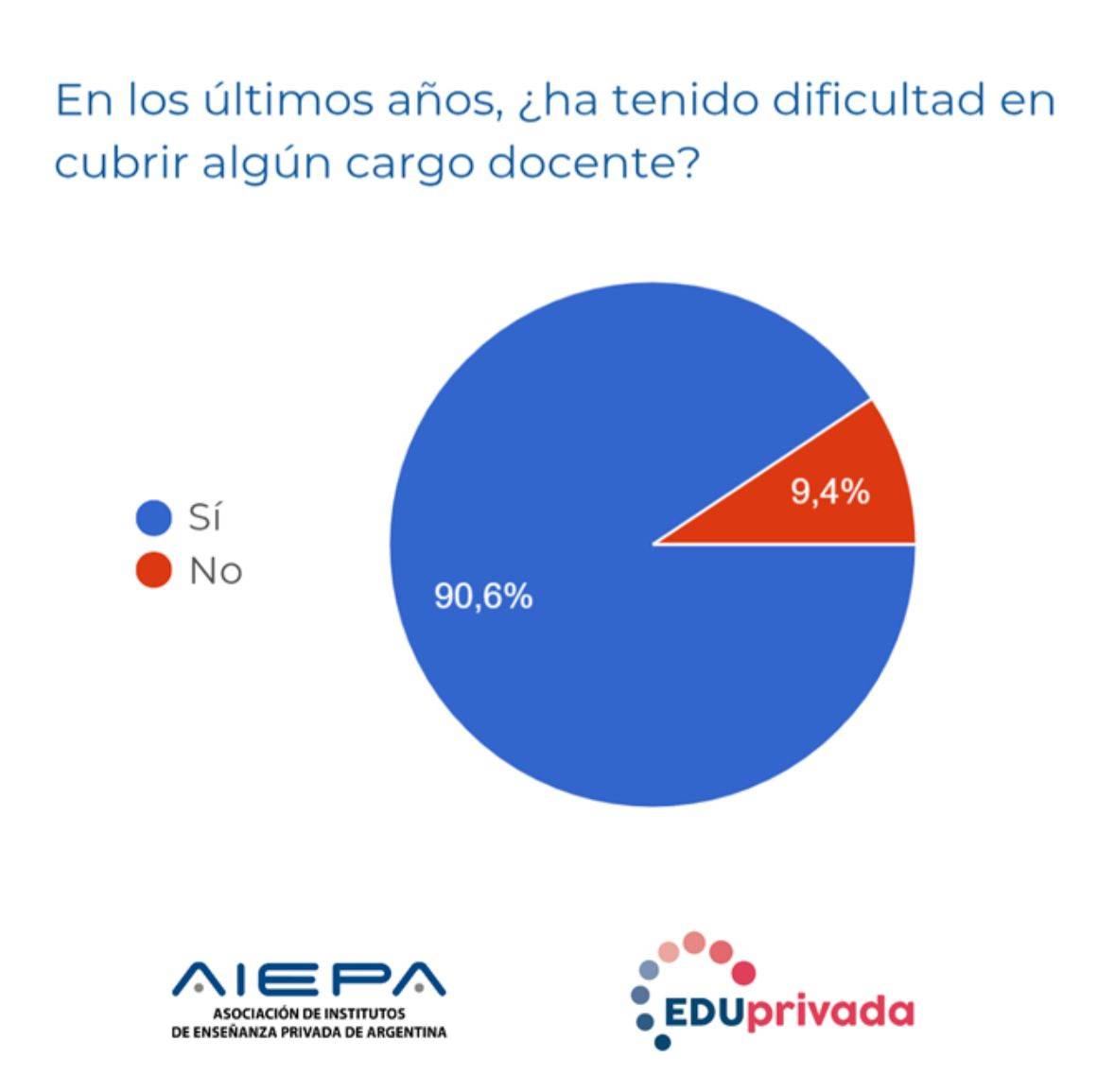 La cobertura de cargos docentes en colegios de todos los niveles se hace cada vez más complicado. Así lo demuestra un relevamiento realizado por Eduprivada, la plataforma de empleo educativo que desarrolló la Asociación de Institutos de Enseñanza Privada de Argentina (AIEPA), en establecimientos de todo el país: El dato más contundente es que el 90% de las escuelas consultadas afirmaron haber tenido dificultades para cubrir al menos un cargo docente en el último tiempo.
