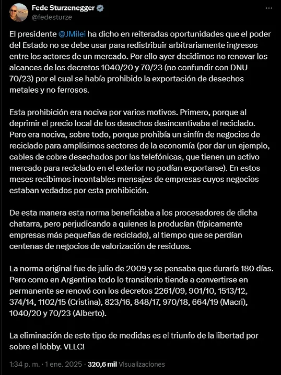 Sturzenegger añadió que esta prohibición beneficiaba a los grandes procesadores de chatarra, pero perjudicaba a los productores más pequeños y limitaba el acceso al mercado internacional. (NA)