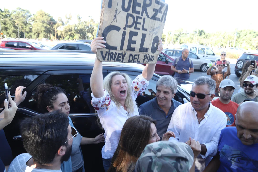 Al bajarse del automóvil que los trasladó, la secretaria general de la Presidencia levantó un cartel que le alcanzaron que decía: “Las fuerzas del cielo. Virrey del Pino”.