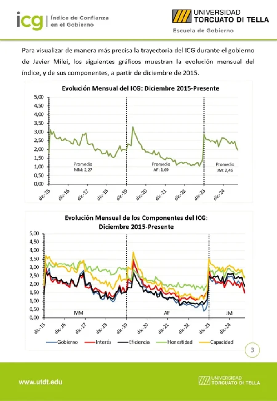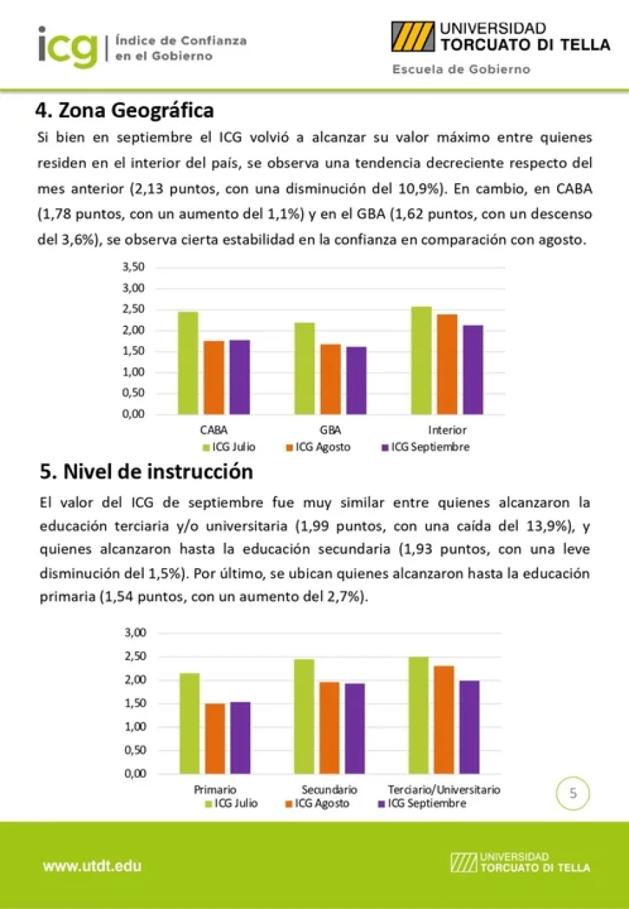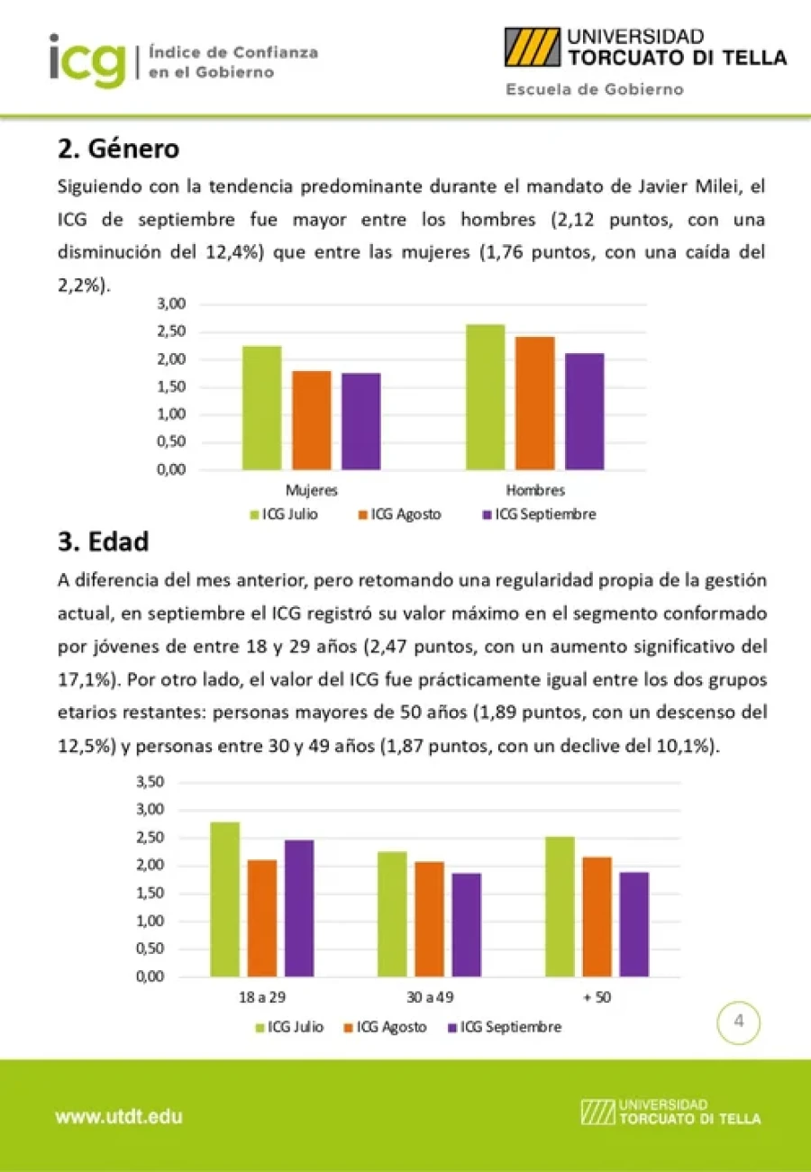 El Índice de Confianza en el Gobierno (ICG) elaborado por la Universidad Torcuato Di Tella se ubicó en 1,94 puntos en septiembre, lo que implicó una caída mensual del 8,2% y del 10% interanual, alcanzando el nivel más bajo desde que Javier Milei asumió la presidencia.