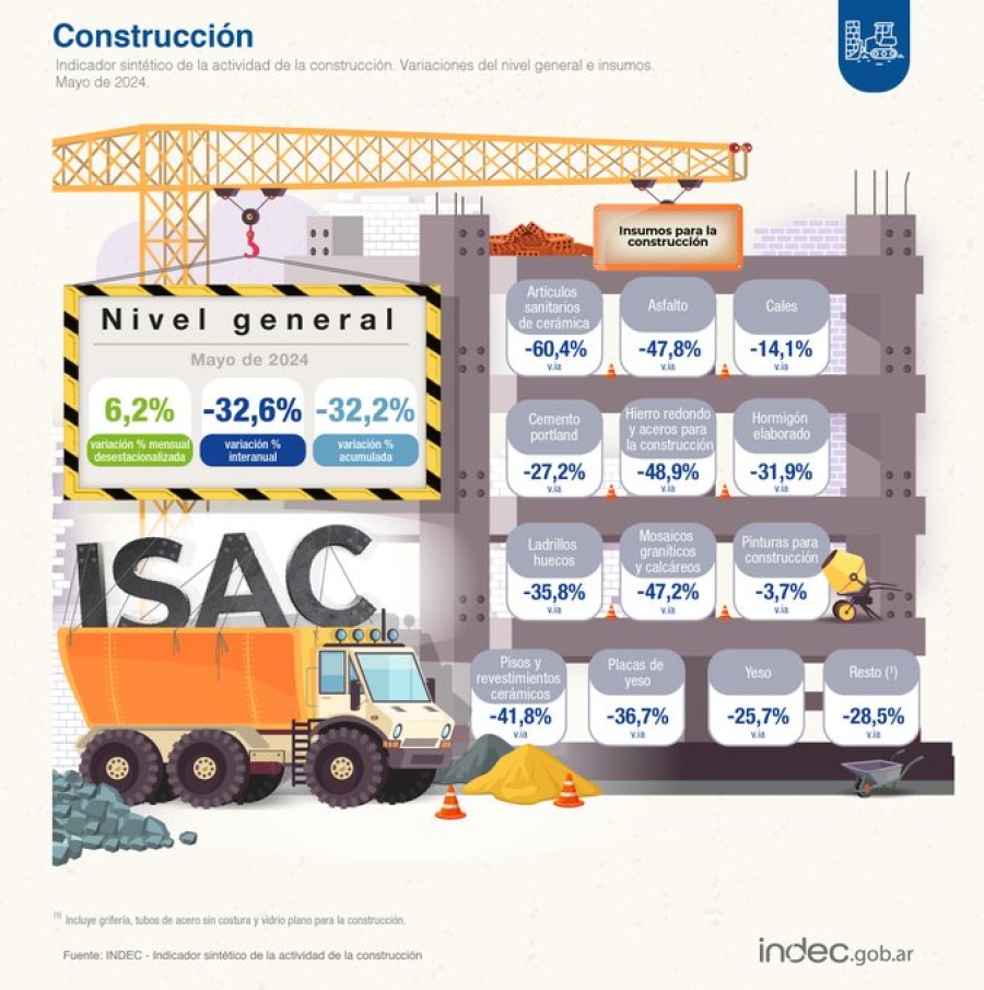 La recesión hace estragos en la industria y la construcción, con caídas que llegan a superar el 30%, según el INDEC. En mayo, el Índice de producción industrial manufacturero (IPI manufacturero) cayó 14,8% respecto de igual mes de 2023. Además, el acumulado de enero-mayo de 2024 presenta una disminución de 15,2% respecto a igual período de 2023.