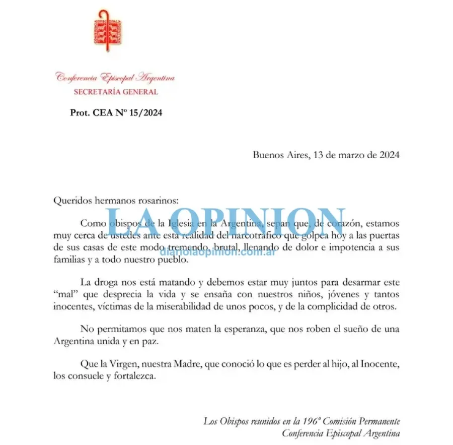 En medio de la conmoción por los ola de violencia que sacude la ciudad de Rosario, la Iglesia alertó que "la droga nos está matando" a los argentinos y llamó a la unión para "desarmar este mal". Mediante una carta, la Conferencia Episcopal Argentina manifestó su cercanía y preocupación por el avance de la droga y llamó a la unidad en tiempos difíciles.