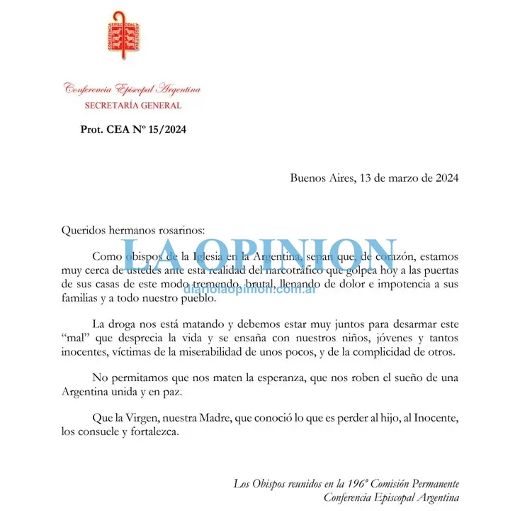 "Como obispos de la Iglesia en la Argentina, sepan que, de corazón, estamos muy cerca de ustedes ante esta realidad del narcotráfico que golpea hoy a las puertas de sus casas de este modo tremendo, brutal, llenando de dolor e impotencia a sus familias y a todo nuestro pueblo", afirmaron los obispos en la carta, mostrando solidaridad con los ciudadanos rosarinos.