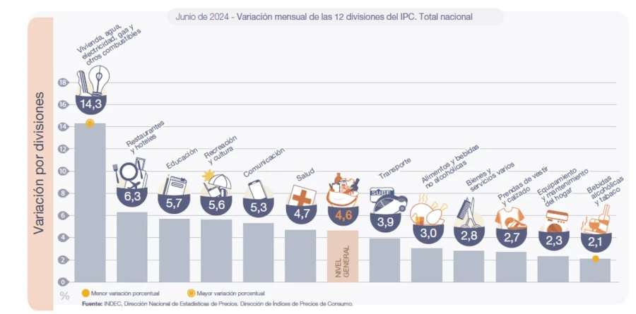 Las dos divisiones que registraron las menores variaciones en junio fueron Bebidas alcohólicas y tabaco (2,1%) y Equipamiento y mantenimiento del hogar (2,3%).A nivel de las categorías, Regulados (8,1%) lideró el incremento, seguida por Estacionales (4,4%) y el IPC Núcleo (3,7%). La mayor alza de precios se produjo en la región de Cuyo, donde subieron 5,1%.