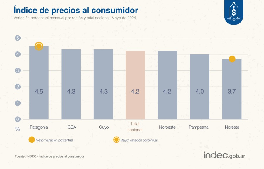 El Nivel general del Índice de precios al consumidor registró un alza mensual de 4,2% en mayo de 2024, menos de la mitad del 8,8% que marcó abril. Para encontrar un índice de estos niveles, hay que ir hasta enero 2022, cuando la inflación marcó 3,9%. En lo que va del año acumula una variación de 71,9%. En la comparación interanual, el incremento alcanzó el 276,4%.