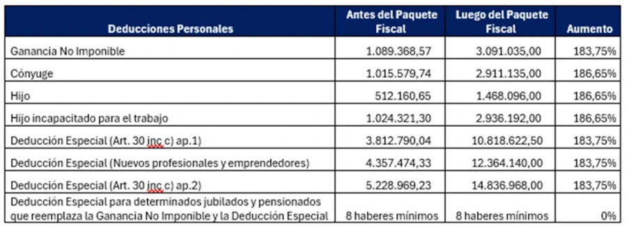 Se incrementan las deducciones personales entre un 183,75% y un 186,65%. No hay cambios respecto a la deducción especial para determinados jubilados y pensionados que se mantiene en 8 haberes mínimos garantizados