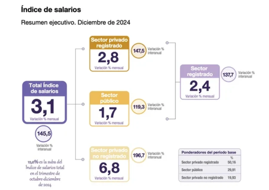 En diciembre de 2024, el Índice de salarios se incrementó 3,1% mensual y 145,5% interanual.