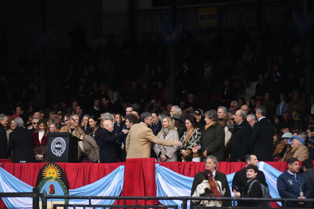 Tras intensas deliberaciones e inspecciones logísticas, se resolvió finalmente la distribución del palco presidencial. A la izquierda de Milei se ubicó Luis Caputo junto a su esposa, y a la derecha, el presidente de la Sociedad Rural, Nicolás Pino, con su pareja. A su lado se sentó finalmente Jorge Macri, acompañado por su esposa, la periodista Belén Ludueña.