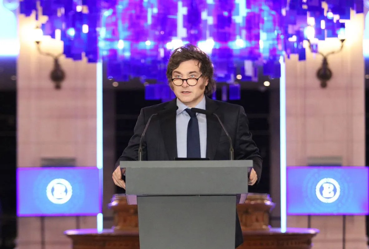 Milei al brindar su mensaje en el acto de cambio de nombre del ex Palacio de Correos. Crédito: NA