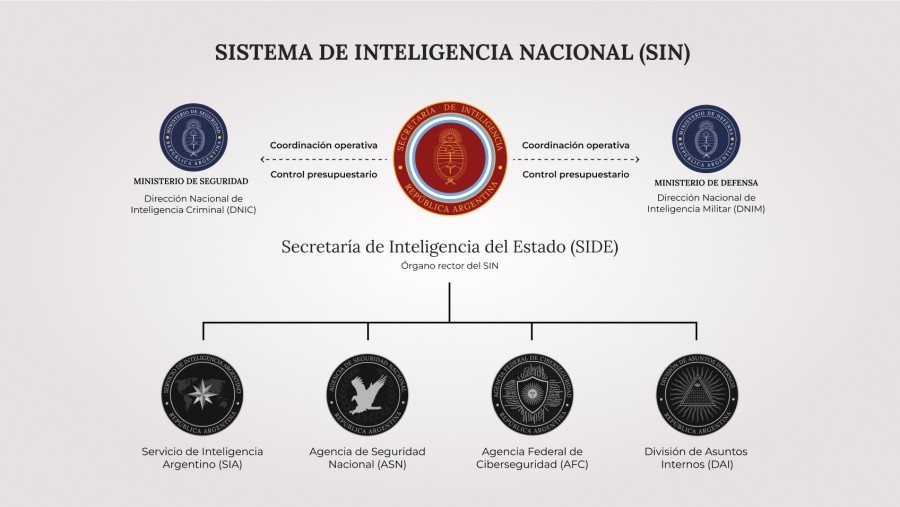 A su vez, la SIDE, como órgano rector del Sistema de Inteligencia Nacional, tendrá a su cargo la coordinación operativa y el control presupuestario de la Dirección Nacional de Inteligencia Criminal (DNIC) y de la Dirección Nacional de Inteligencia Estratégica Militar (DNIEM), dependientes del Ministerio de Seguridad y del Ministerio de Defensa respectivamente.