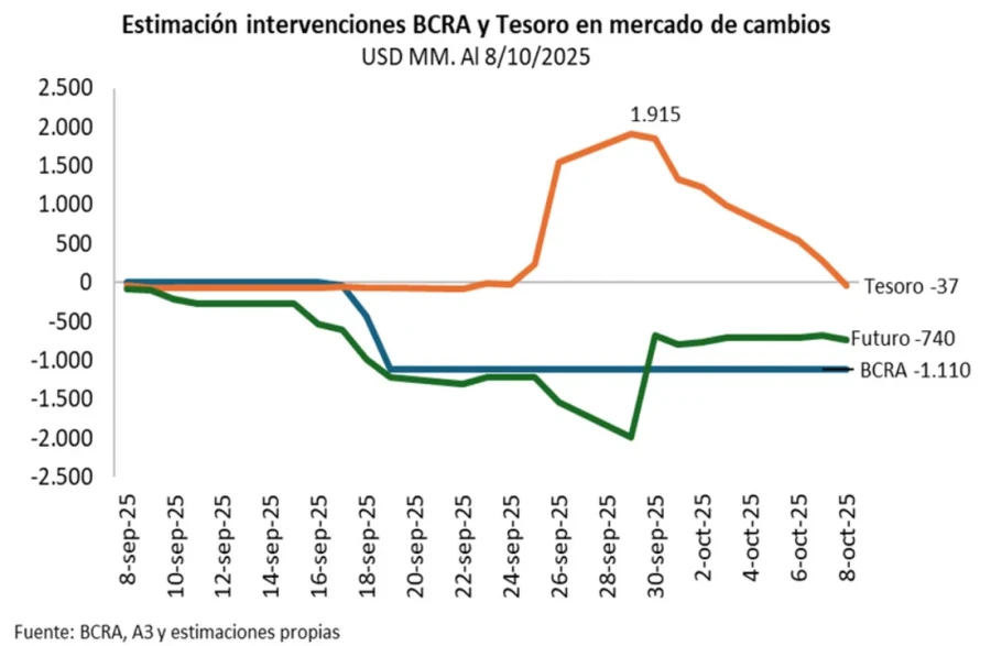 Finalizado el plazo de liquidación de estos últimos dólares, desde el 30 de septiembre, el Tesoro fue vendedor de divisas por un monto acumulado que Quantum estima en de USD 1.952 millones, un promedio diario de USD 280 millones, que se aceleró en los últimos días, cuando las ventas diarias oscilaron entre USD 330-450 millones.