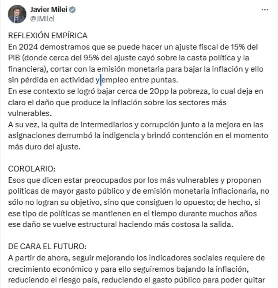 El Presidente dividió su posteo de las redes sociales en tres partes, en la primera, titulada "REFLEXIÓN EMPÍRICA", sostuvo que en 2024 "se pudo hacer un ajuste fiscal de 15% del PIB" y "cortar con la emisión monetaria para bajar la inflación sin pérdida en actividad y empleo entre puntas".