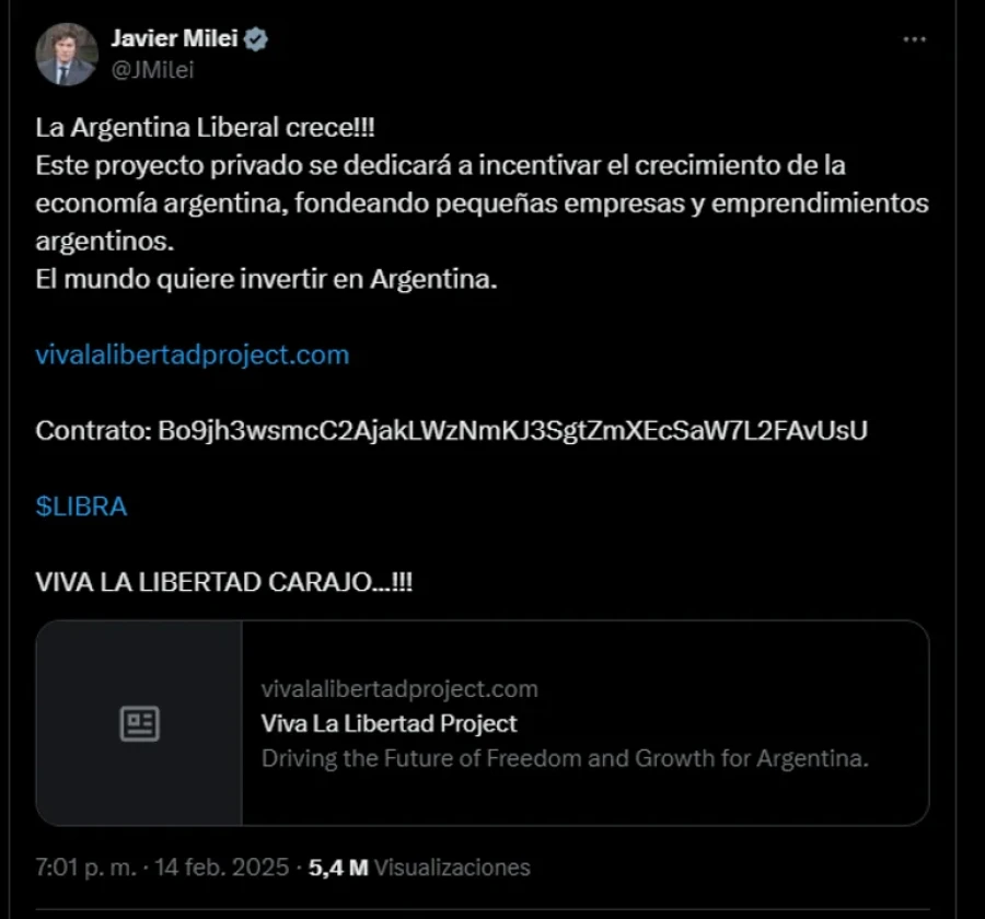 El pasado 14 de febrero, Milei sorprendió al anunciar en X (ex Twitter) el lanzamiento de Viva La Libertad Project, una iniciativa presentada como un puente entre inversores internacionales y emprendedores argentinos, a través del token $LIBRA.