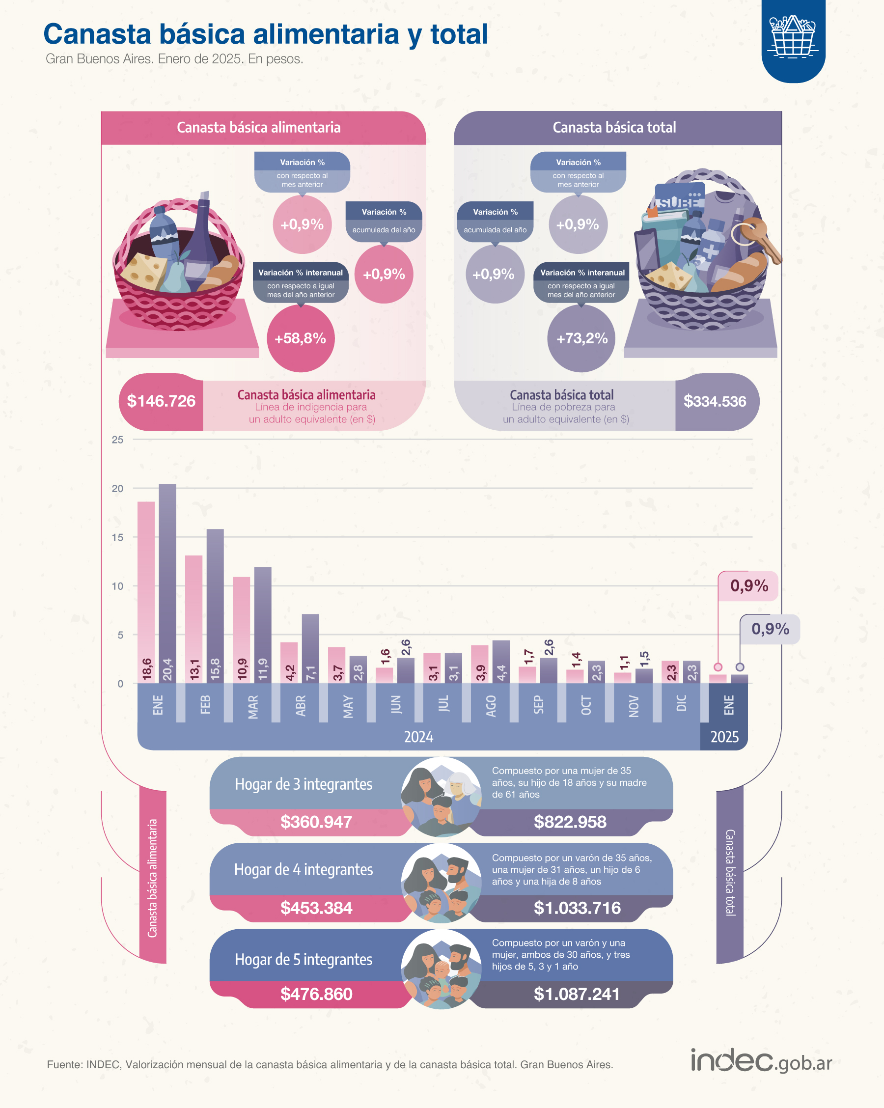 Una familia necesitó $1.033.716 en enero para no ser pobre y $453.384 para no ser indigente, según los cálculos difundidos ayer por el INDEC. Durante enero, la variación mensual de la canasta básica alimentaria (CBA) -se utiliza para estimar la indigencia- y de la canasta básica total (CBT) -pobreza- fue de 0,9%, muy por debajo del 2,2% de inflación. En un año, la canasta total subió 73,2%, por debajo del costo de vida.