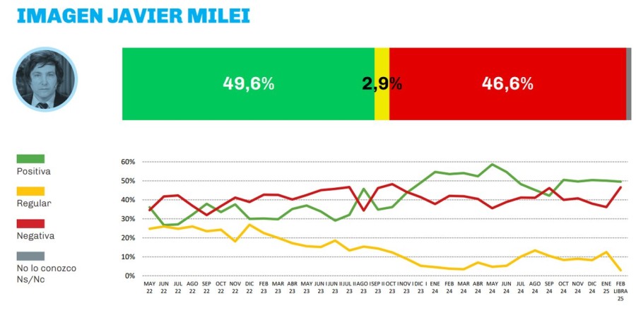 El informe difundido por la consultora Giacobbe arrojó que la imagen positiva de Milei se mantuvo en 49,6%, sosteniendo el nivel desde octubre del año pasado. Sin embargo, la opinión negativa sobre el presidente sí se incrementó 10 puntos y alcanzó un 46,6%, elevándose entre quienes tenían una opinión "regular" sobre el presidente hasta ese momento.