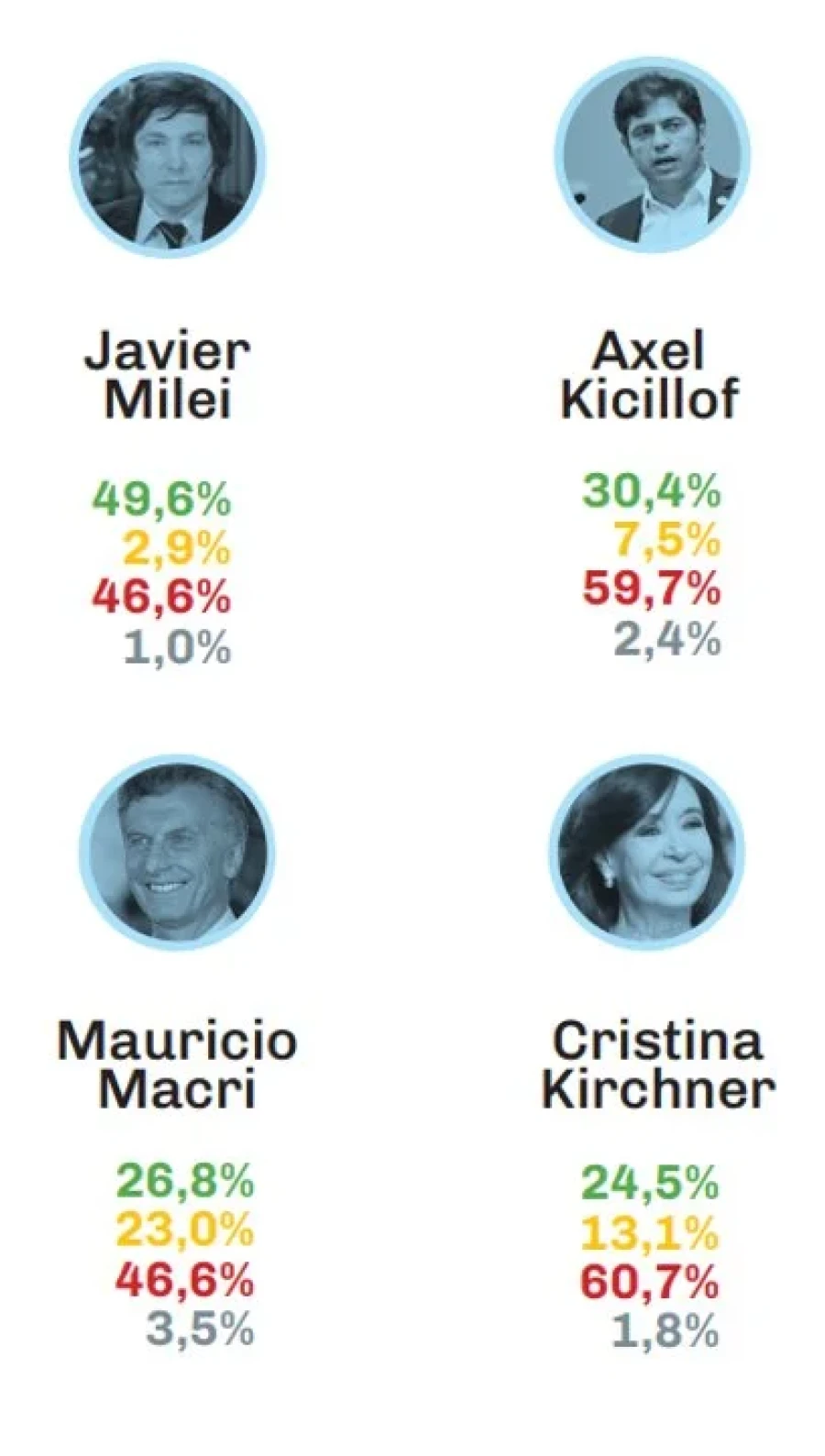 La imagen de Milei se mantiene como la más positiva entre los principales dirigentes tras el escándalo cripto, seguida por la del gobernador de la provincia de Buenos Aires, Axel Kicillof (30,4%); y los ex presidentes Mauricio Macri (26,8%) y Cristina Fernández de Kirchner (24,5%).