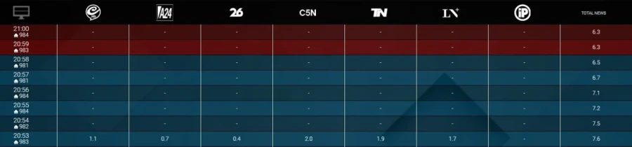 A diferencia de otras mediciones, en esta ocasión no se discrimina por canal, sino que se muestra la suma de toda la audiencia televisiva.