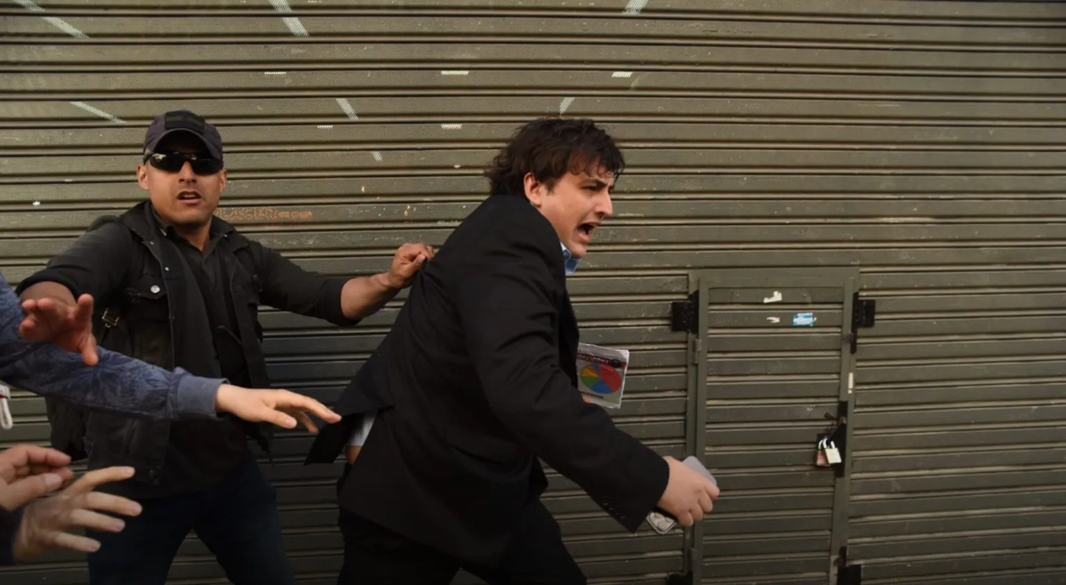 El militante libertario, Fran Fijap, fue agredido con elementos contundentes y debió refugiarse en un local comercial de venta de empanadas ubicado en la intersección de Callao y Avenida Rivadavia, en un hecho que motivó la intervención de la Policía de la Ciudad. Los empleados lograron cerrar la persiana y el joven quedó refugiado adentro mientras manifestantes pateaban la puerta.