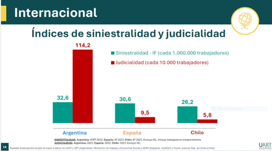 A modo de referencia, en 2023 Argentina tuvo 114,2 juicios por cada 10.000 trabajadores cubiertos, mientras que países como España y Chile registran apenas 9,5 y 5,8.