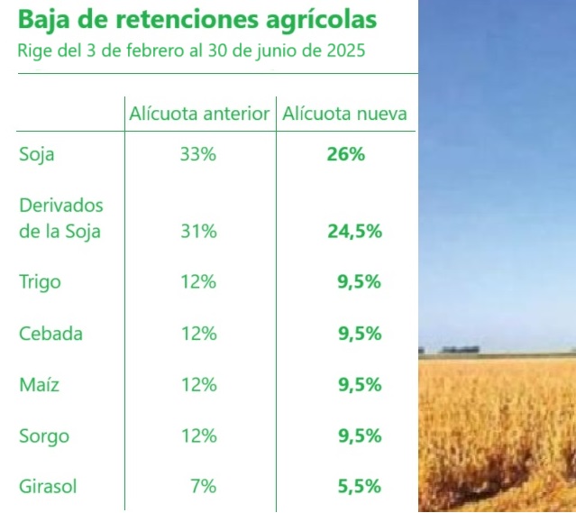 De esta manera, la soja (poroto) baja de 33% a a 26%; la soja (aceite y harina), del 31% al 24,5%; el trigo, la cebada, el sorgo y el maíz pasan del 12% al 9,5%; y el girasol, del 7%, al 5,5%.