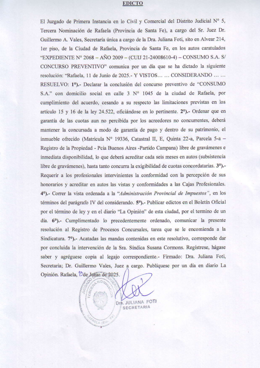 El Juzgado de Primera Instancia en lo Civil y Comercial del Distrito Judicial N° 5, Tercera Nominación de Rafaela (Provincia de Santa Fe), a cargo del Sr. Juez Dr. Guillermo A. Vales, Secretaría única a cargo de la Dra. Juliana Foti, sito en Alvear 214, 1er piso, de la Ciudad de Rafaela, Provincia de Santa Fe, en los autos caratulados “EXPEDIENTE N° 2068 – AÑO 2009 – (CUIJ 21-24008610-4) – CONSUMO S.A. S/ CONCURSO PREVENTIVO” comunica por un día que se ha dictado la siguiente resolución: “Rafaela, 11 de Junio de 2025.- Y VISTOS… … CONSIDERANDO … … RESUELVO: 1°).- Declarar la conclusión del concurso preventivo de “CONSUMO S.A.” con domicilio social en calle 3 N° 1045 de la ciudad de Rafaela, por cumplimiento del acuerdo, cesando a su respecto las limitaciones previstas en los artículo 15 y 16 de la ley 24.522, oficiándose en lo pertinente. 2°).- Ordenar que en garantía de las cuotas aun no percibida por los acreedores no concurrentes, deberá mantener la concursada a modo de garantía de pago y dentro de su patrimonio, el inmueble ofrecido (Matricula N° 19336, Catastral II, E, Quinta 22-a, Parcela 5-a – Registro de la Propiedad - Pcia Buenos Aires -Partido Campana) libre de gravámenes e inmediata disponibilidad, lo que deberá acreditar cada seis meses en autos (subsistencia libre de gravámenes), hasta tanto concurra la exigibilidad de cuotas concordatarias. 3°).- Requerir a los profesionales intervinientes la conformidad con la percepción de sus honorarios y acreditar en autos las vistas y conformidades a las Cajas Profesionales. 4°).- Correr la vista ordenada a la “Administración Provincial de Impuestos”, en los términos del parágrafo IV del considerando. 5°).- Publicar edictos en el Boletín Oficial por el término de ley y en el diario “La Opinión” de esta ciudad, por el termino de un día. 6°).- Cumplimentado lo precedentemente ordenado, comunicar la presente resolución al Registro de Procesos Concursales, tarea que se le encomienda a la Sindicatura. 7°).- Acatadas las mandas contenidas en este resolutivo, corresponde dar por concluida la intervención de la Sra. Síndica Susana Cormons. Regístrese, hágase saber y agréguese copia al legajo correspondiente.- Firmado: Dra. Juliana Foti, Secretaria; Dr. Guillermo Vales, Juez a cargo. Publíquese por un día en diario La Opinión. Rafaela, 13 de Junio de 2025.
