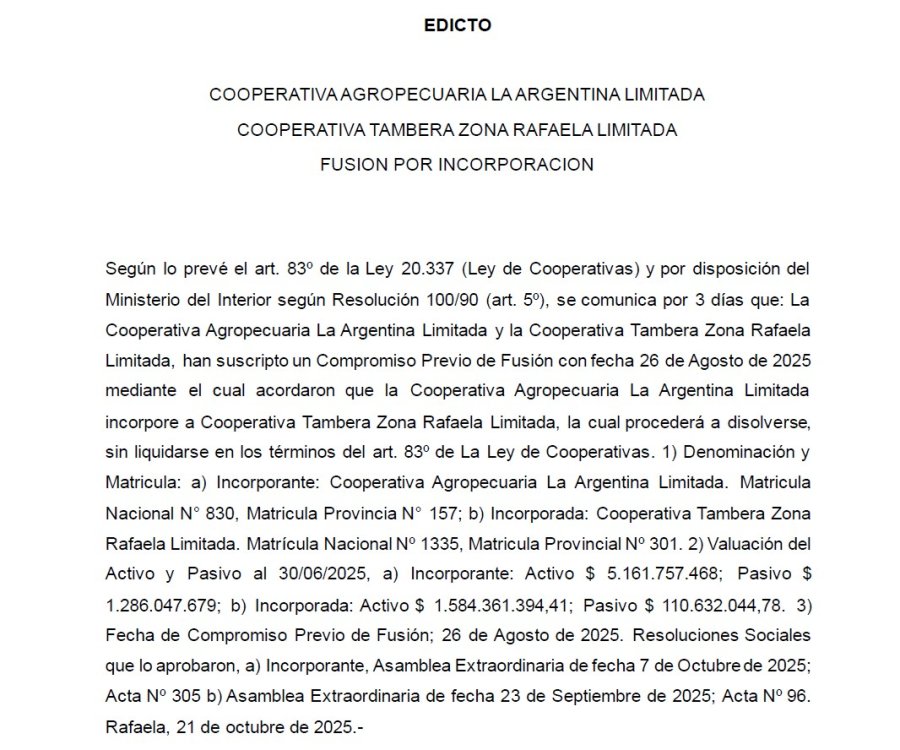 Según lo prevé el art. 83º de la Ley 20.337 (Ley de Cooperativas) y por disposición del Ministerio del Interior según Resolución 100/90 (art. 5º), se comunica por 3 días que: La Cooperativa Agropecuaria La Argentina Limitada y la Cooperativa Tambera Zona Rafaela Limitada han suscripto un Compromiso Previo de Fusión con fecha 26 de Agosto de 2025 mediante el cual acordaron que la Cooperativa Agropecuaria La Argentina Limitada incorpore a Cooperativa Tambera Zona Rafaela Limitada, la cual procederá a disolverse, sin liquidarse en los términos del art. 83º de La Ley de Cooperativas.