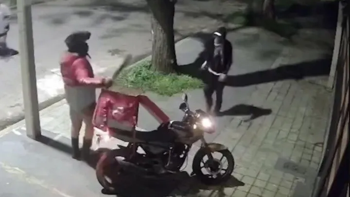 Una cámara de seguridad, registró que el delivery sacó un machete de su mochila, y corrió a los asaltantes tras dejar la moto estacionada sobre la vereda, porque se dio cuenta de que intentaban robarle.