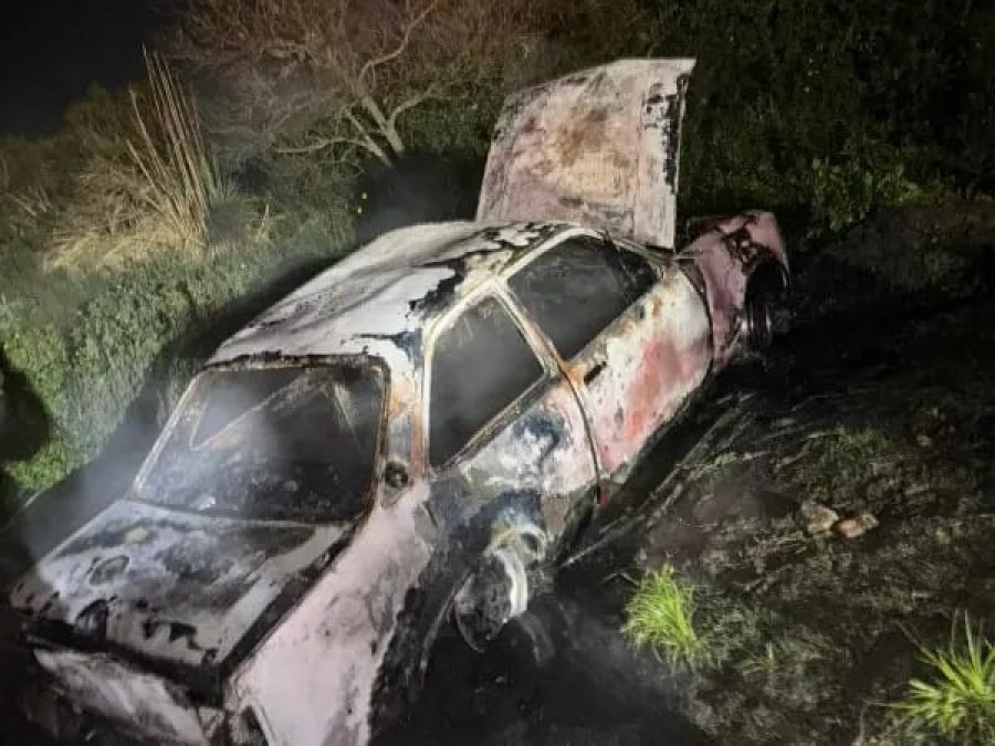 El auto totalmente quemado en calle Tettamanti, al noreste de la ciudad. Crédito: FOTO LA OPINIÓN