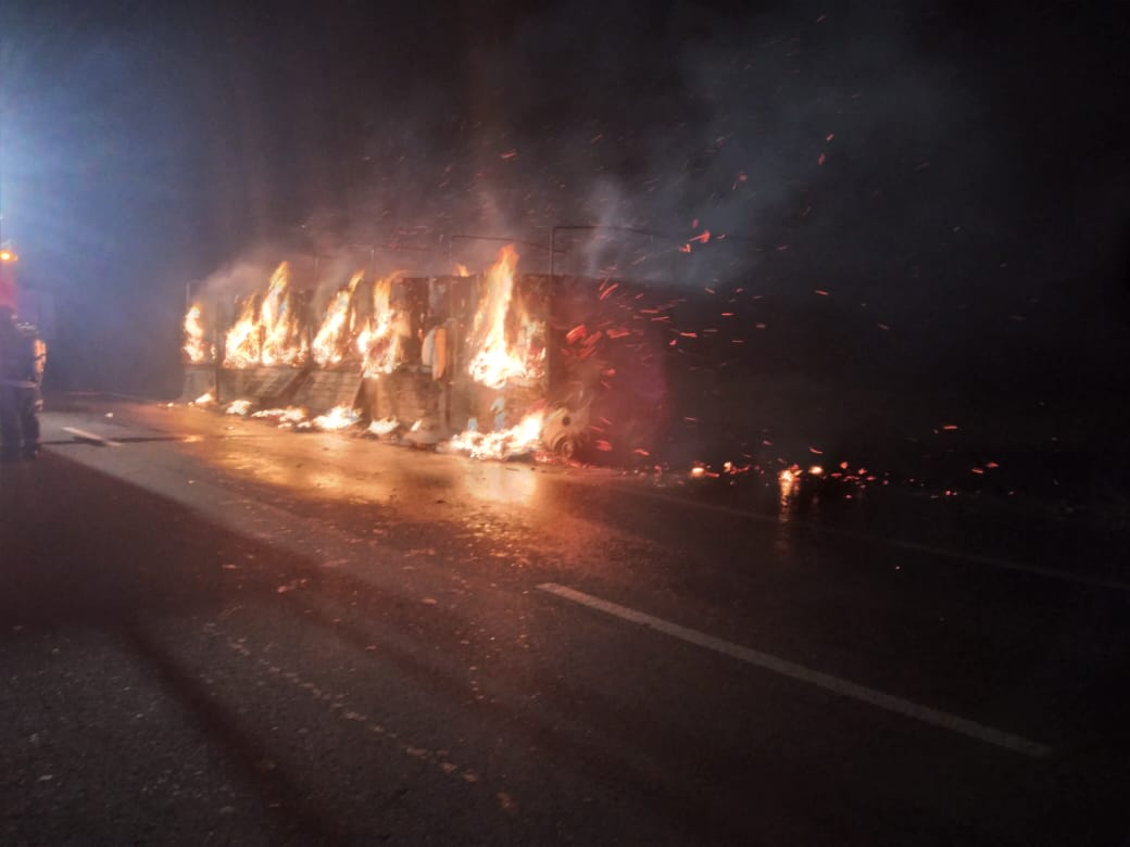 También se destacó que abajo de la parte trasera del acoplado, se ubicó incrustado un automóvil que por la acción del fuego no pudo ser identificado, al igual que la persona que lo manejaba, y quienes podrían haberlo acompañado.