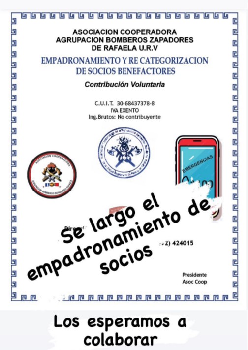 Con la firma de Gerardo Marcos Brarda, presidente de la Asociación Cooperadora de Bomberos Zapadores Rafaela, los bomberos pertenecientes a la fuerza policial de la Provincia, informaron que están llevando a cabo el Empadronamiento y Recategorización de socios, para que los ciudadanos, empresas y comercios, puedan colaborar con esa institución.