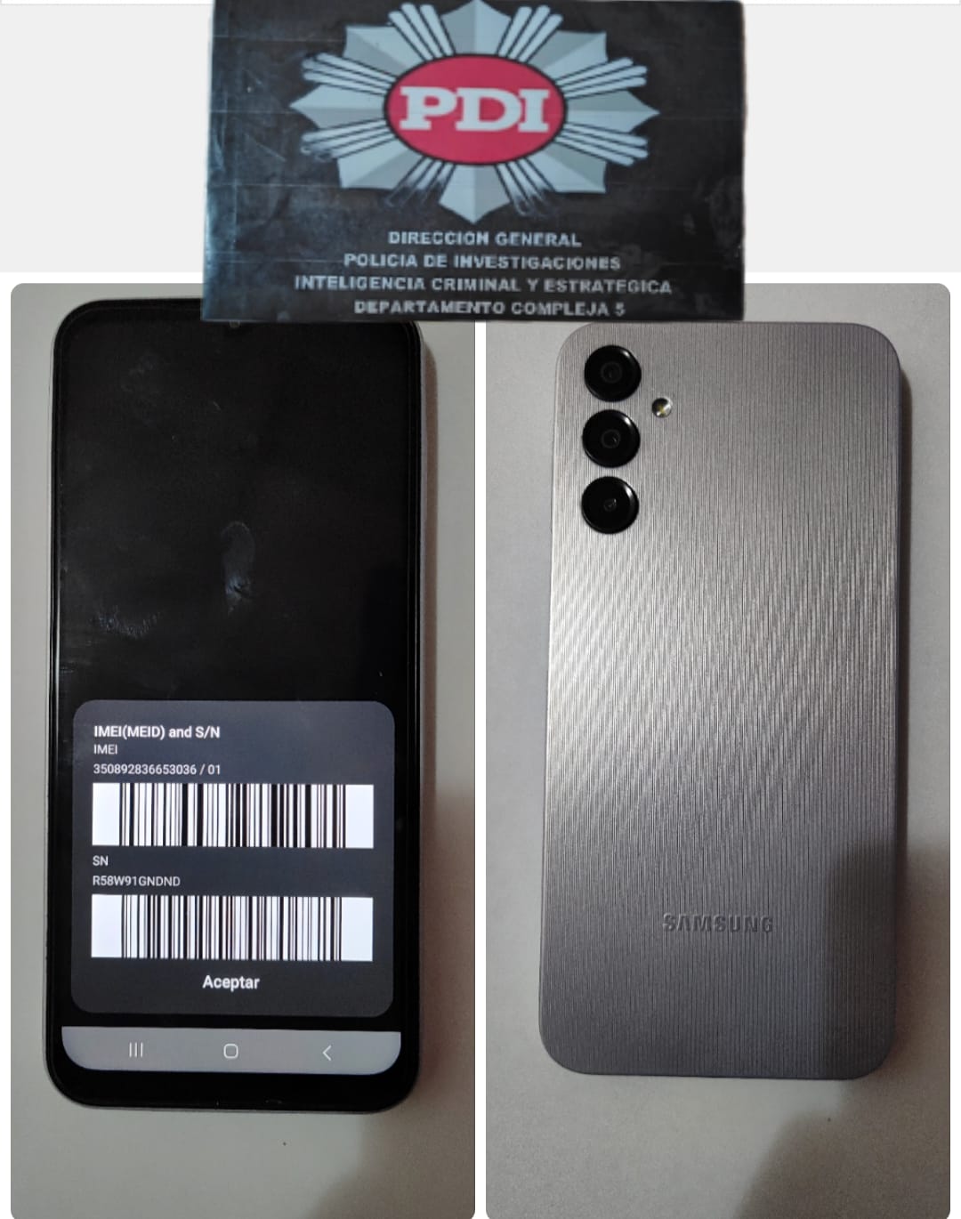 Con testigos de actuación se realizó la misma, arrojando resultado positivo, y procediéndose al secuestro de un teléfono celular marca Samsung modelo A14, de color gris, confirmándose que el número de IMEI era coincidente con el aparato buscado y sustraído.