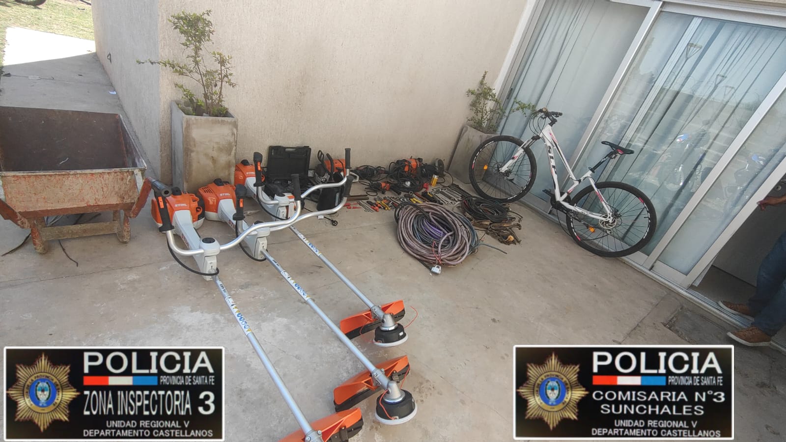 Los ilícitos tuvieron varios damnificados, ya identificados, y lo faltante tuvo que ver con una tablet, una soldadora, un taladro percutor, tres amoladoras, cinco rollos de cable, dos prolongaciones, tres manojos de llaves, una llave tipo criquet, un par de llaves tipo T, un juego de destornilladores, varios retazos de cables, dos pinzas, una maza, una carretilla, tres motoguadañas, dos motosierras, y una pava eléctrica.