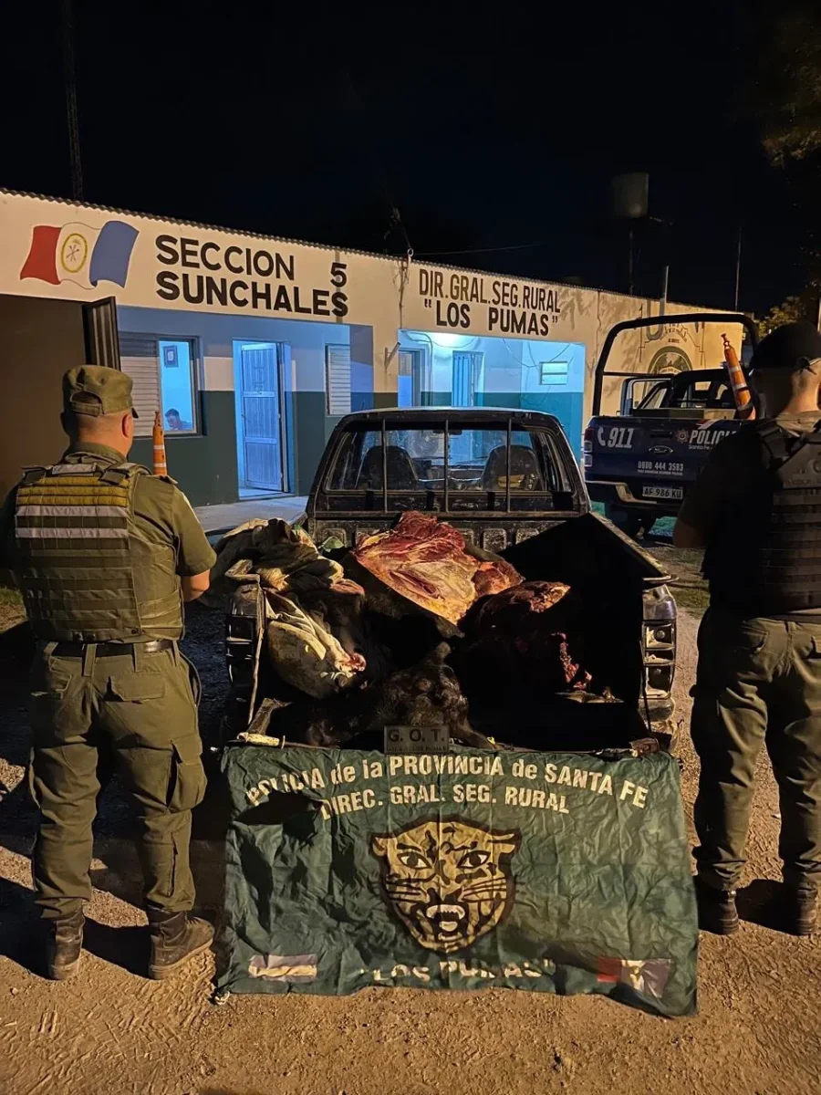 Al no poder justificar la procedencia del animal faenado, los agentes procedieron a la aprehensión de los hombres, al secuestro preventivo del vehículo, un cuchillo, una chaira y la totalidad del producto cárnico, siendo todo trasladado por razones jurisdiccionales a la Sección N° 5 de "Los Pumas", ubicada en la ciudad de Sunchales.