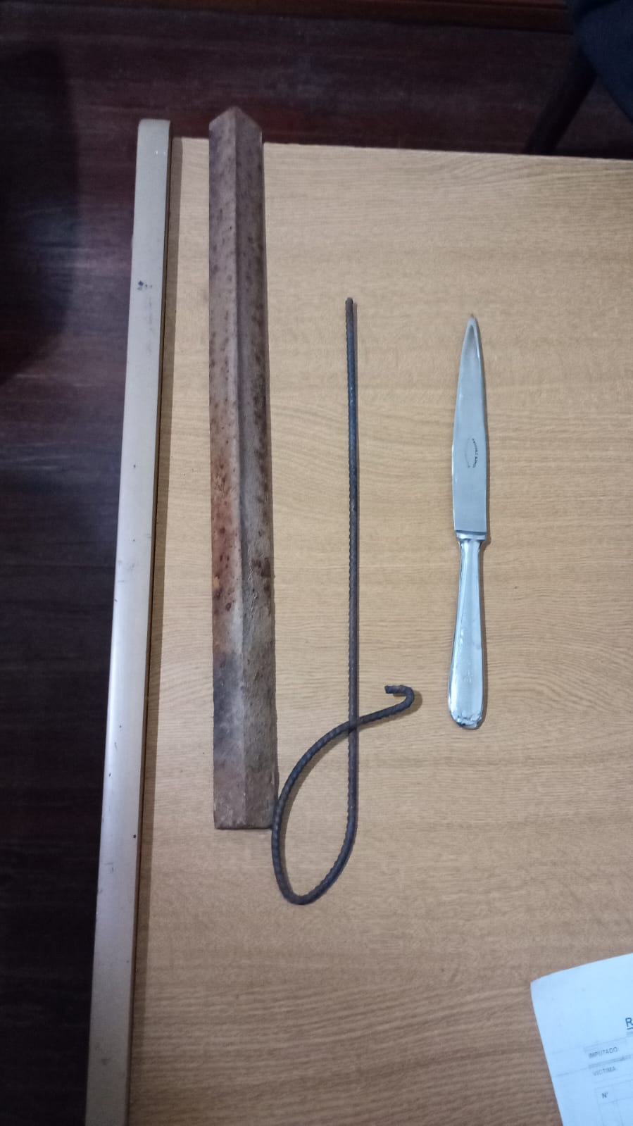 Además, se llevó a cabo el secuestro de un cuchillo afinado en su punta tipo chuza, un hierro nervado doblado en una de sus puntas tipo empuñadura, un hierro ángulo, y un canasto de basura, siendo todo trasladado a la Seccional 2ª.