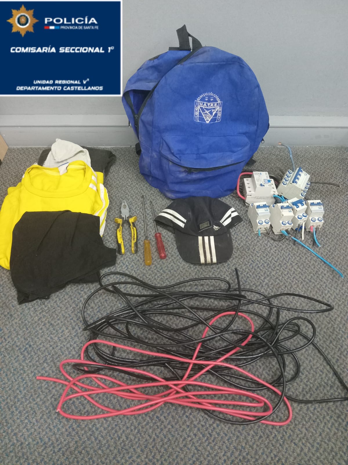 Agentes de la Guardia Urbana Rafaelina lo interceptaron, en momento que llevaba el elemento antes descripto, conteniendo rollos de cables, seis llaves térmicas, una pinza, dos destornilladores, un pantalón de jean, una remera, un buzo y una gorra, en tanto personal policial detuvo a Agustín Ezequiel B.
