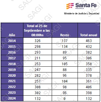 El período analizado va del 1° de enero al 25 de septiembre, lapso en el que se produjeron en todo el territorio provincial 132 homicidios dolosos. De esa cifra, 100 (el 76 %) ocurrieron en los departamentos Rosario (70 casos) y La Capital (30).