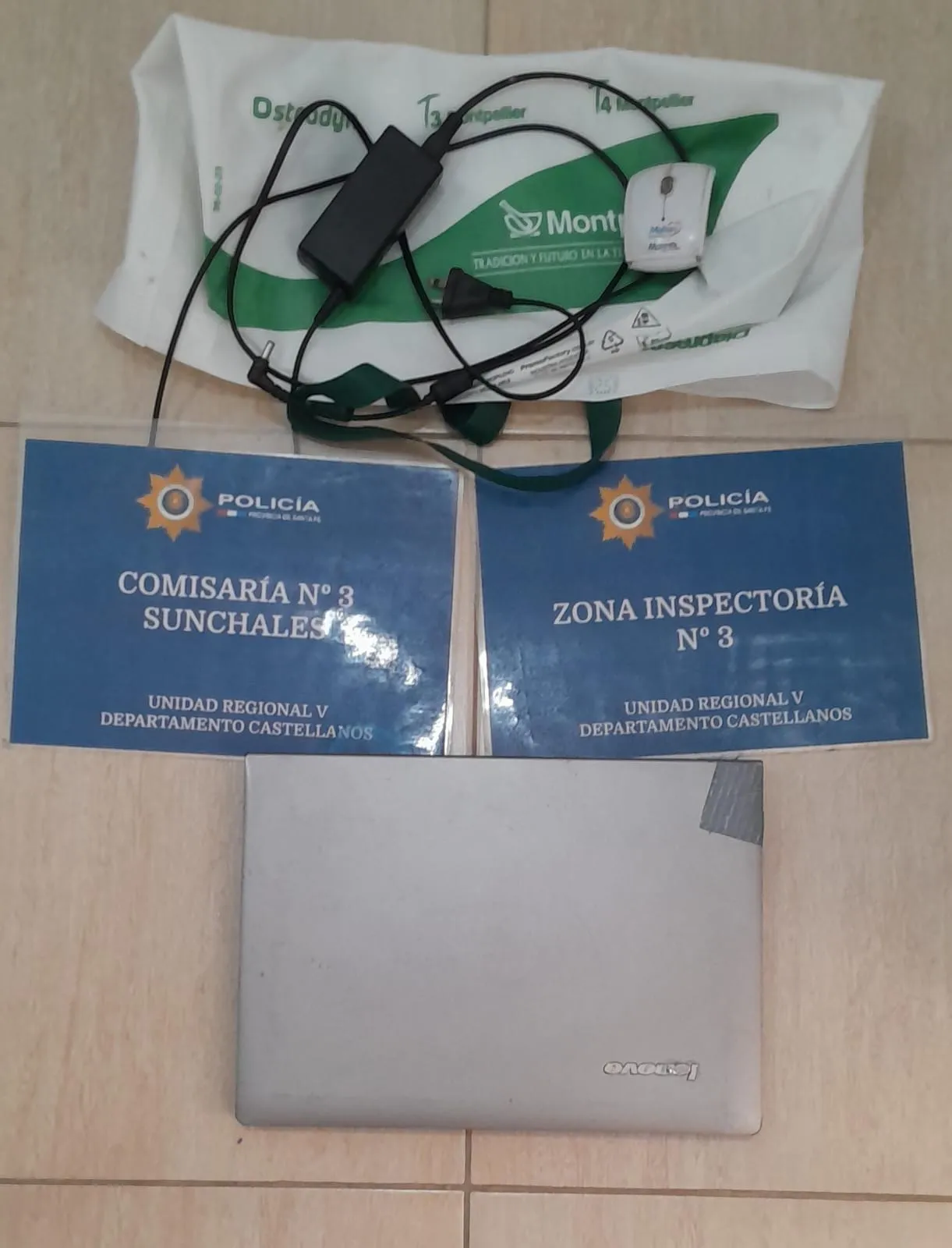 Uniformados de Sunchales, al hacer paso por la intersección de calles Falucho y Oroño, divisaron a dos sujetos que se conducían en bicicletas quienes al notar la presencia de los policías, ingresaron a un terreno baldío y descartaron una bolsa conteniendo la notebook.