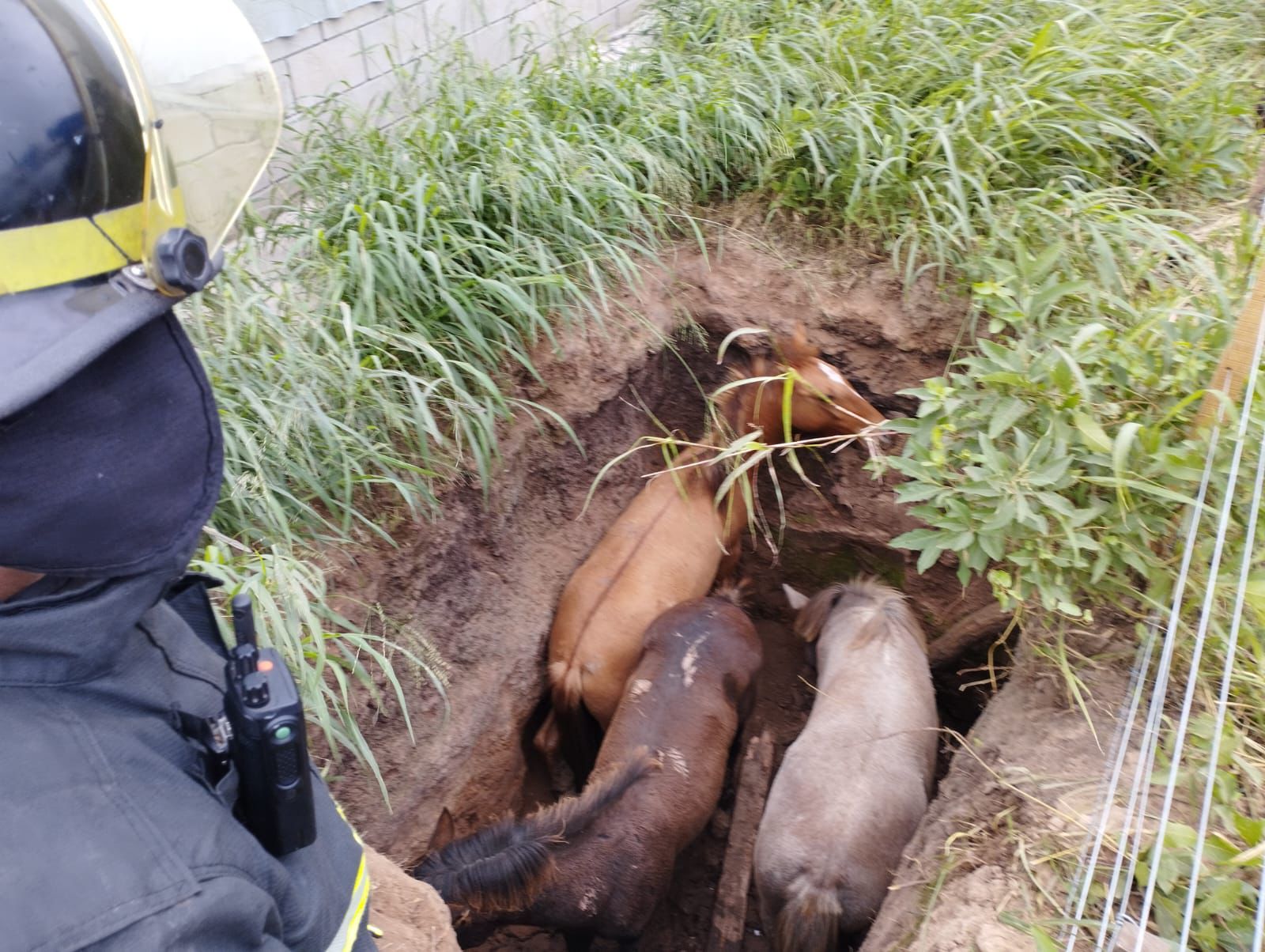 En el lugar los Bomberos observaron a tres equinos en el interior del citado pozo de gran profundidad, por lo que procedieron a realizar tareas de rescate mediante el uso de cuerdas y palas de mano, hasta el arribo de una retroexcavadora que permitiese rescatar a los animales en desgracia.