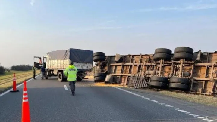 Poco después, se produjo el vuelco el acoplado del camión, que transportaba granos.
