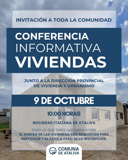 ATALIVA.- La Comuna local difundió que el jueves 9 de octubre, en la Sociedad Italian, se realizará una conferencia informativa junto a la Dirección Provincial de Vivienda y Urbanismo.