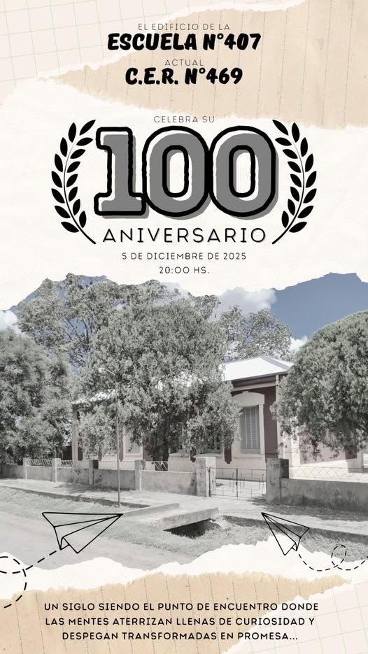 AURELIA NORTE.- La Escuela Nº 407 y el CER Nº 469 invitan a participar del acto oficial para celebrar el Centenario, frente al mástil, el día viernes 5 de diciembre, a las 20.00 hs.