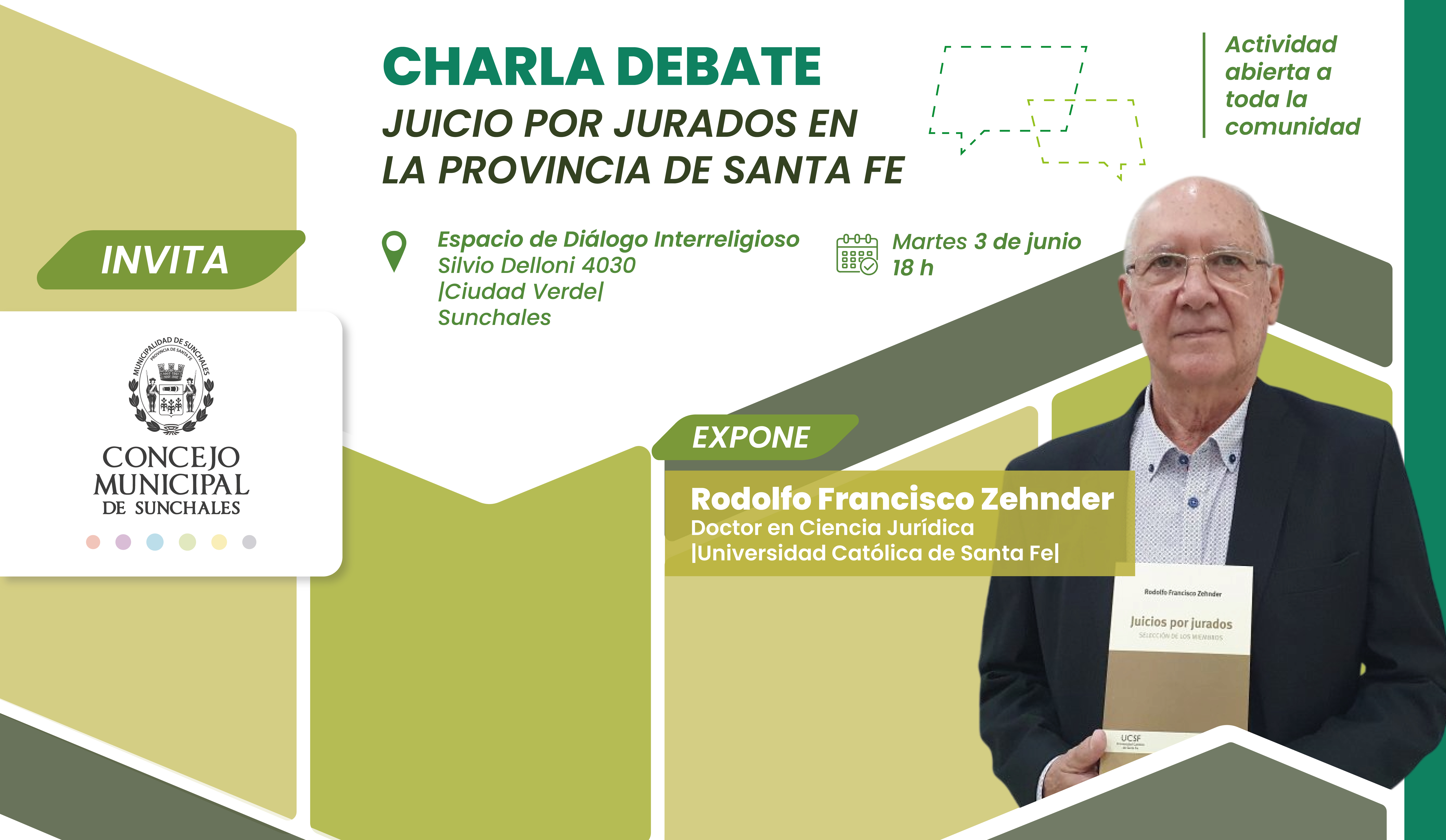 SUNCHALES (De nuestra Agencia). - Para el próximo 3 de junio el Concejo Municipal convoca a participar de una charla debate sobre “Juicio por jurados en la provincia de Santa Fe”, la cual estará a cargo del Dr. Rodolfo Francisco Zehnder.