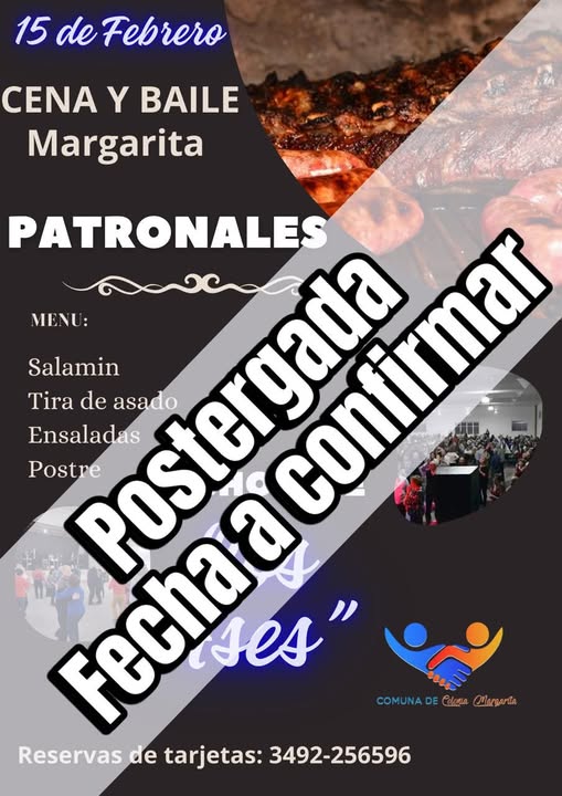 COLONIA MARGARITA.- Desde la Comun se difundió que lamentan comunicar la suspensión de la Cena del próximo sábado 15 , todos los informes meteorológicos coinciden y anticipan inestabilidad durante todo el fin de semana, con importantes precipitaciones en nuestra región.
