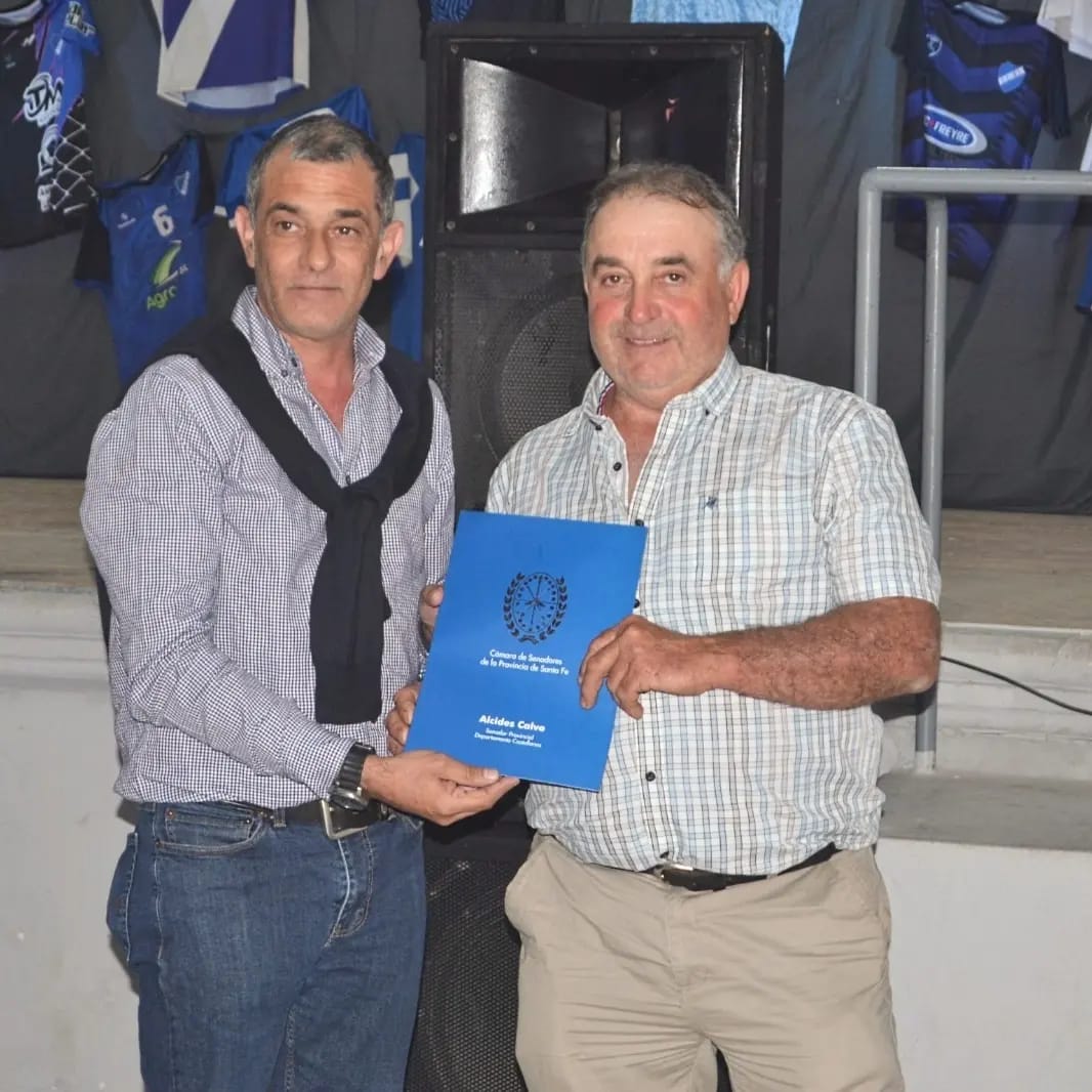En un momento se produjo la entrega por parte del equipo del senador Calvo de un acompañamiento para la realización del evento en manos del presidente del club.
